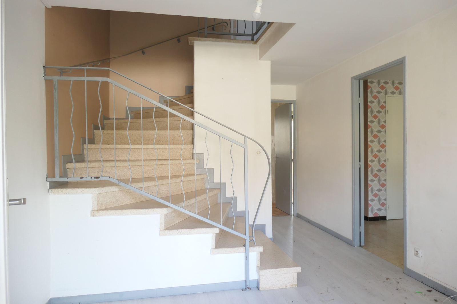A l'étage : deux chambres avec placards, une cuisine semi équipée ouvrant sur terrasse - une pièce de vie de 27m² ouvrant sur la terrasse également.